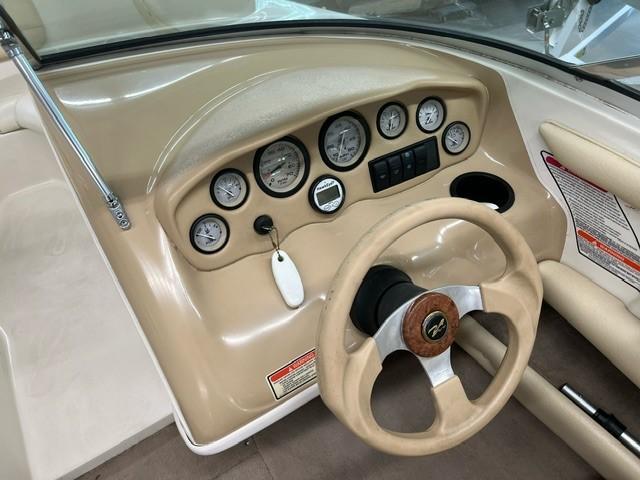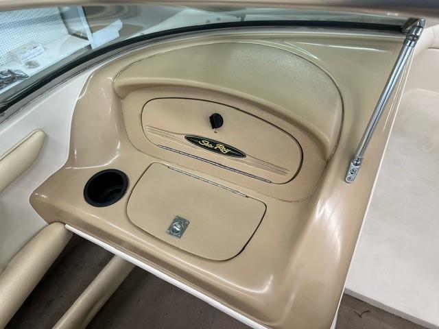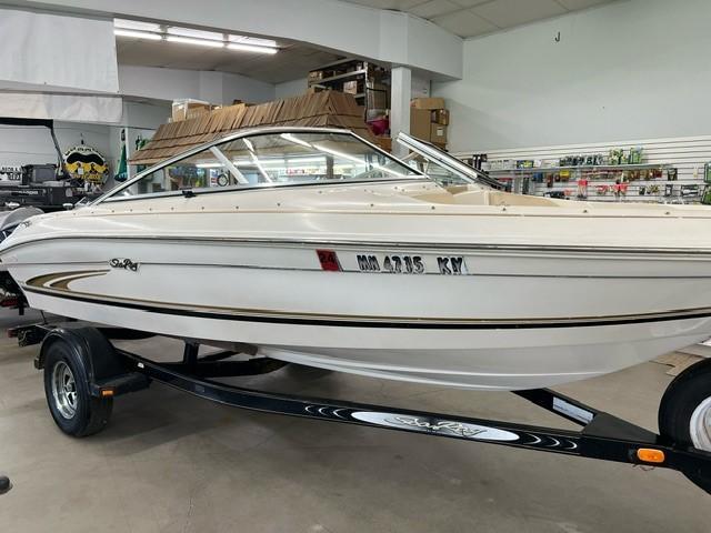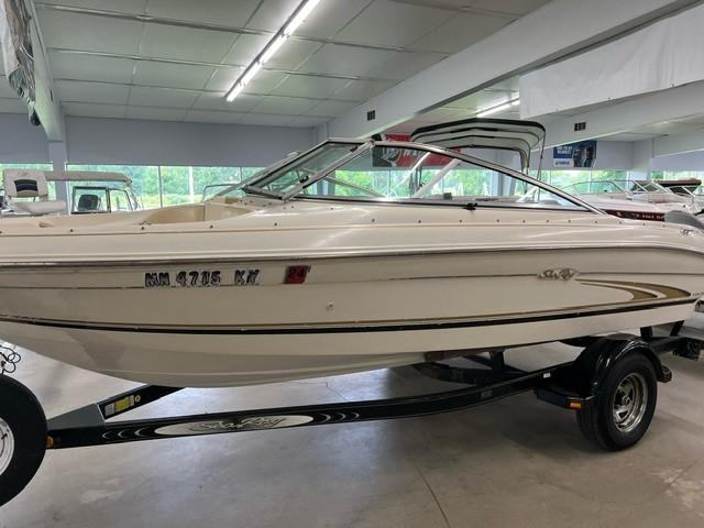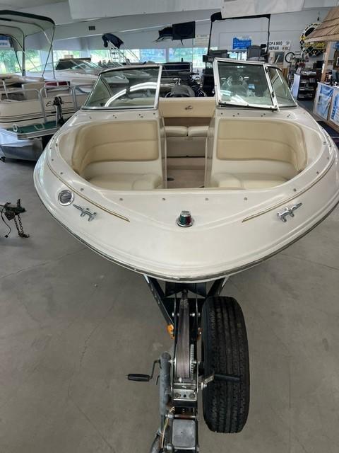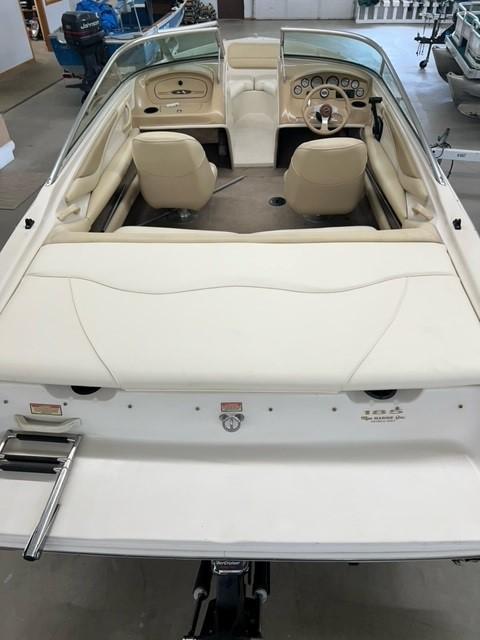 This boat is easy to trailer, easy to operate, easy to maintain and easy to afford! A complete boat, motor and trailer package, it's virtually warry-free with a integral fiberglass floor system, high-performance vinylster resin, and stainless steel hardware for years of enjoyment. For all-day fun, the 185 Bowrider comes with a standard Clarion AM-FM digital cassette stereo with two seperate speakers, beverage holders, and a built-in insulated ice chest at the dash. Marine-grade carpet, redesigned cockpit upholstery, three-piece windshield, and convertable top with interlocking top extrusion and concealed top storage make the ride as comfortable as it is exciting. Tis boat has a stainless steel ski tow eye and integral swim platform with a three=step stainless steel swim ladder, so everything from serious slalom skiing to tubing can be enjoyed as they were meant to be. Aafterward, water toys are easily stowed in the ski and kneeboard storage area complete with mildew-resistant vinyl matting. There is even an injection=,olded ski hatch for more secure storage. Standard cockpit seating features a starboard side swivel bucket seat with portside back-to-back lounger and high-low aft jump seats that form a roomy sunpad over the morotbox, which has an integrated handle and positive latch. Plus there is room for extra guests in the molded bow seating area. In the first of two optional seating plans, there are two bucket sealts with an aft bench seat and sunpad. The second option has back-to-back loungeer seats plus motorbos and jump seats aft. At the helm, the custom soft-touch dash with lockable blove box and visor house Sea Ray's custom backlit instrument cluster including tachometer, fuel guage, speedometer, oil pressure guage and more. Technical feastures like the beefed-up standard 4.3L Alpha I MCM stern drive (190 hp), an automatic bilge pump, power steering, power tilt and trim and audible engine alarms let he captain pilot the 185 Bowrider effortlessly. Trailering is a snap, too. This boat comes complete with its own poainted trailer with free-backing hydraulic surge brakes, Sure Lube bearing protection and a swing-away tougue for easy garage storage.