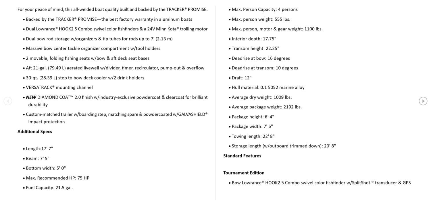 For your ppeace of mind, this all=welded boat quality built and backed by the TRACKER PROMISE.